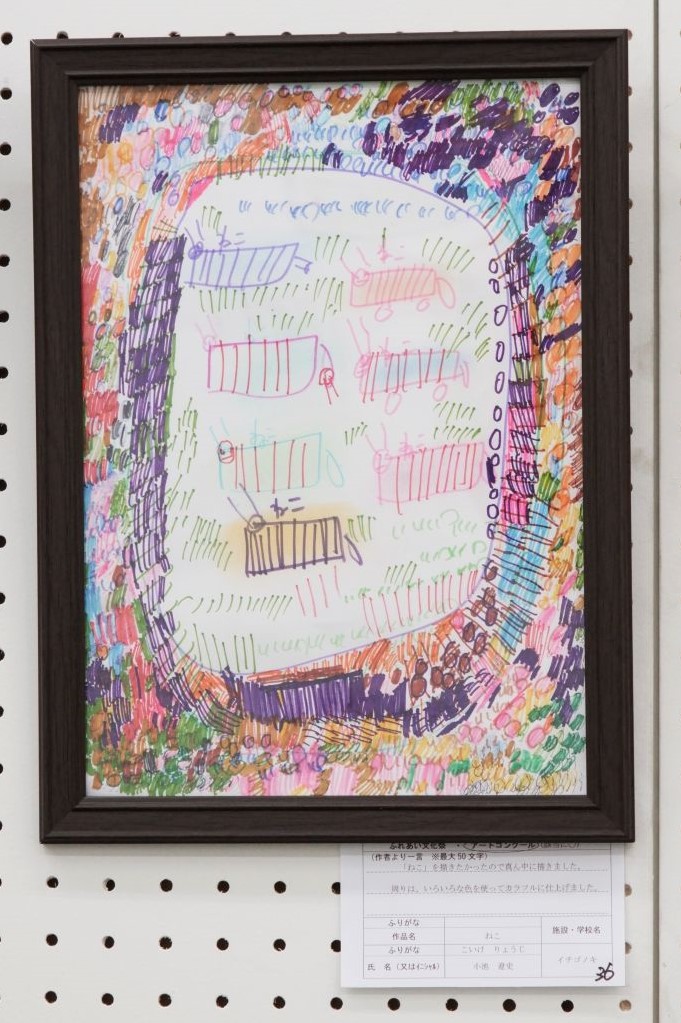 「ねこ」を描きたかったので真ん中に描きました。周りは、いろいろな色を使ってカラフルに仕上げました。